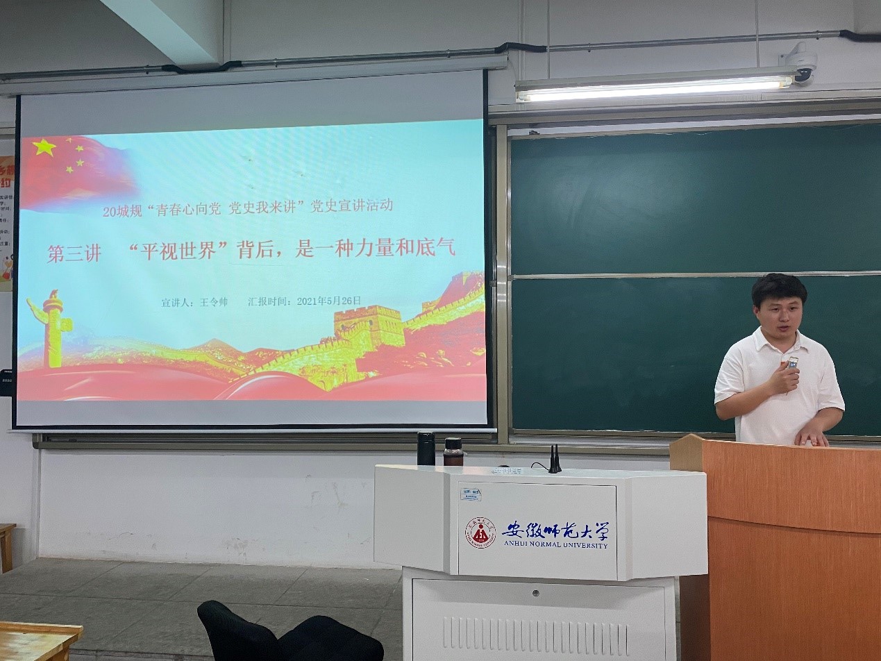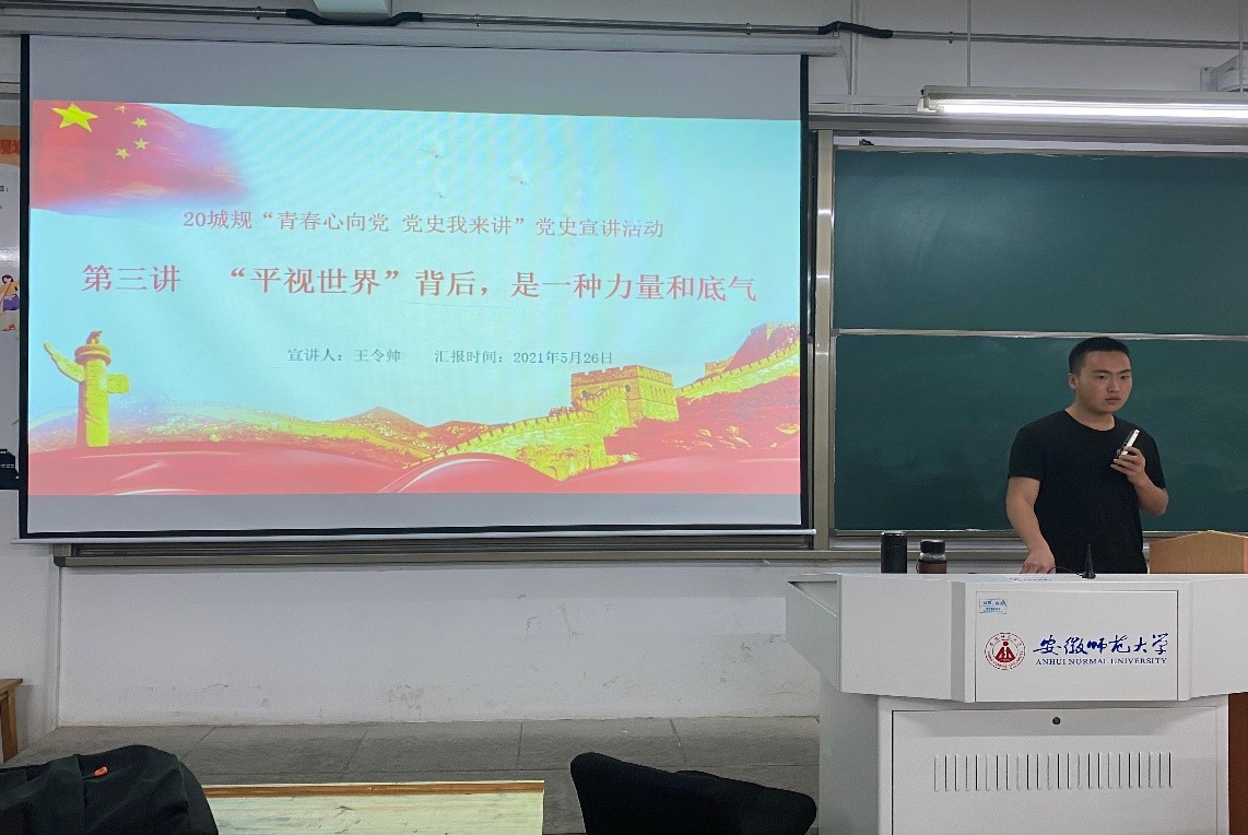刘少杰 耿艺榕)为全面贯彻落实习近平总书记在党史学习教育动员大会上的重要讲话精神,积极响应“学史明理、学史增信、学史崇德、学史力行”的号召,推动“学党史、强信念、跟党走”学习教育持续深化,5月26日晚八点,2020级城乡规划专业“青春心向党 党史我来讲”党史宣讲主题活动第三讲开讲。本次主讲人为班级团支部组织委员、入党积极分子王令帅,主讲主题为《“平视世界”背后,是一种力量和勇气》。