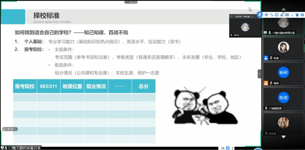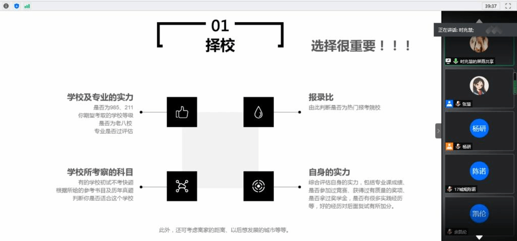 会议共有三部分组成,2017级学生代表进行考研经验分享、专业老师进行考研志愿填报及备考指导和线上互动交流提问。