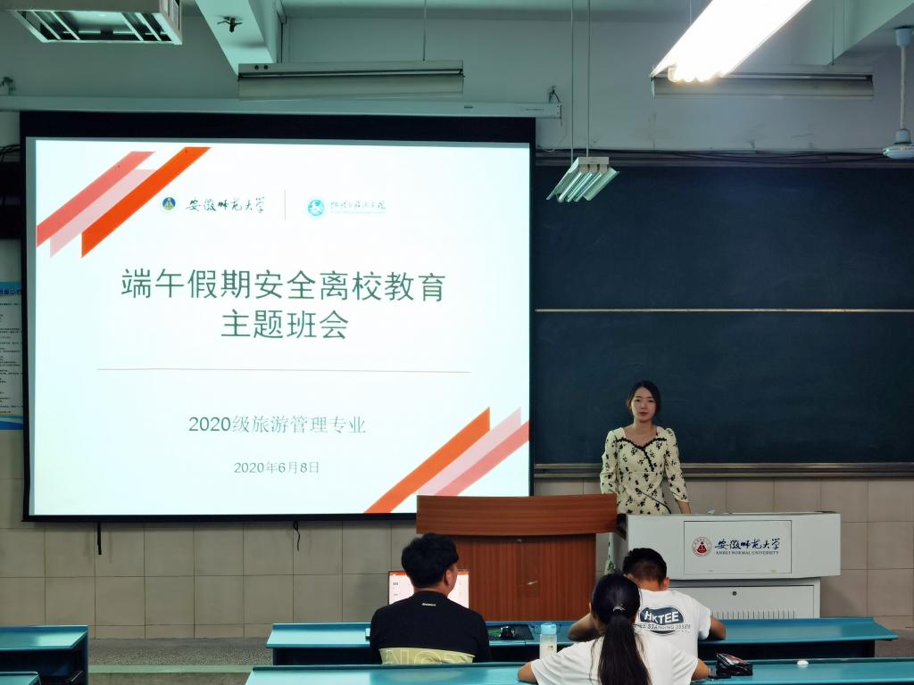 孙云峰 赵佳慧)安全是朵幸福花,合家浇灌美如画。农历五月仲夏,千里粽叶飘香,为了提高学生的安全意识,确保同学们的离校行程安全,从而做好端午节放假期间本科生安全教育管理工作,6月8日晚7点,20级旅游管理专业在行知楼4号楼203教室召开了“端午假期离校安全教育”主题班会,会议由20级旅游管理专业的辅导员赵佳慧主持,20级旅游管理专业全体学生参与。