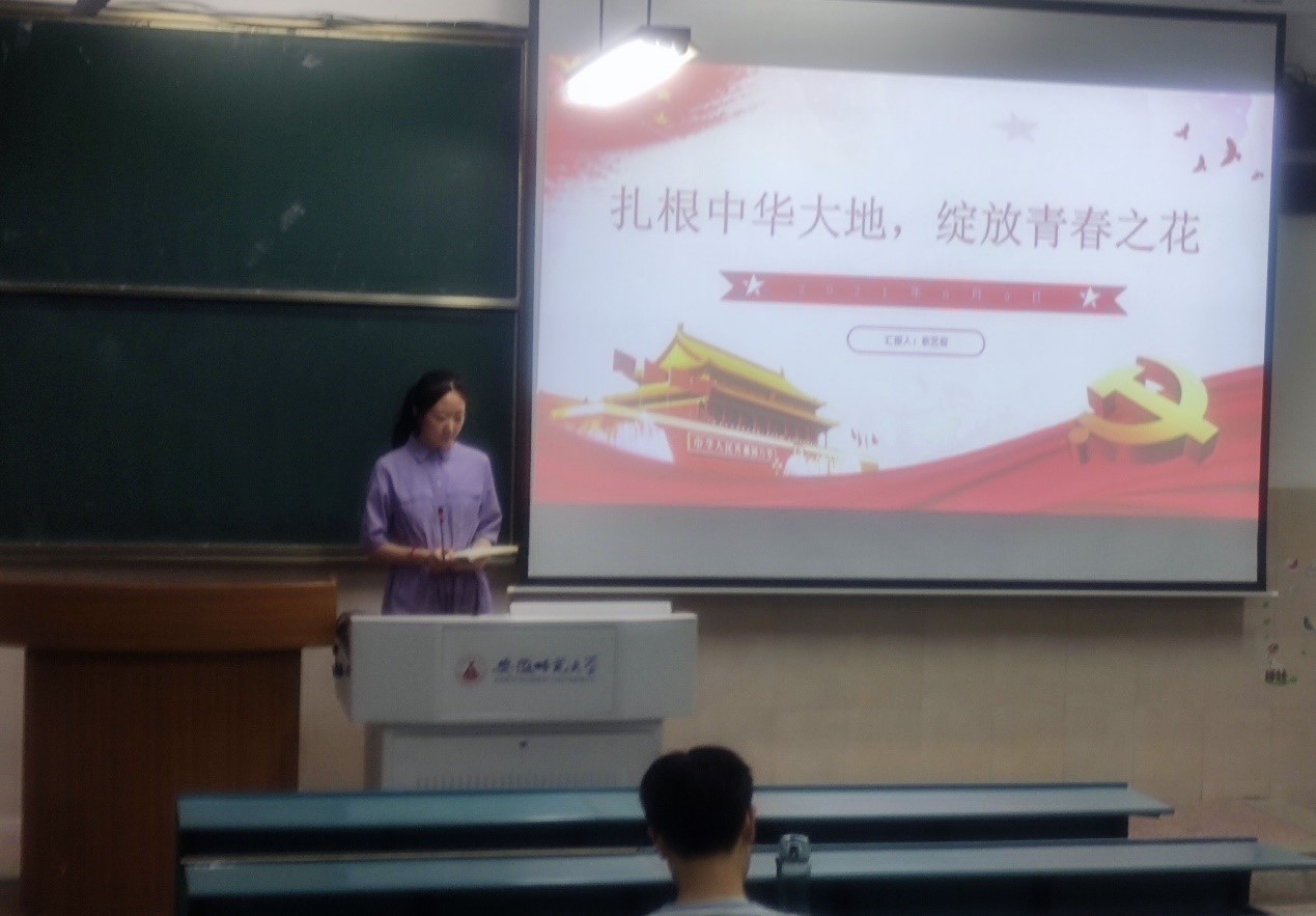 刘少杰 耿艺榕)为全面贯彻落实习近平总书记在党史学习教育动员大会上的重要讲话精神,积极响应“学史明理、学史增信、学史崇德、学史力行”的号召,提高同学们的思想修养,推动“学党史、强信念、跟党走”学习教育持续深化。6月9日晚七点半,2020级城乡规划班“青春心向党 党史我来讲”党史宣讲主题活动第五讲开讲。本次主讲人为班级宣传委员、入党积极分子耿艺榕,主题为《扎根中华大地,绽放青春之花》。