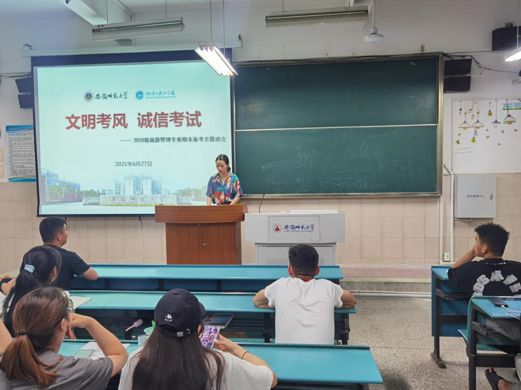 赵佳慧 孙云峰)期末考试临近,为树立优良学风,严格考风考纪,6月28日晚七点,2020级旅游管理专业在行知楼4号楼203教室召开“文明考风,诚信考试”主题班会。班会由辅导员赵佳慧主持,2020级旅游管理专业全体同学参与。