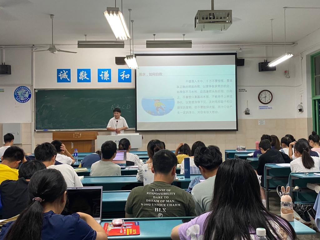 刘少杰从溺水的概念、急救方法、游泳的注意事项、错误和正确的施救方法五个方面向同学们全方位、详细地介绍了防溺水的有关知识。刘少杰叮嘱同学们,假期不要到不熟悉的自然水域中游泳,同时在游泳池中也不可以放松安全警惕。在遇到危机情况时,不要贸然救人,他强调保护好自己才是救人的前提。刘少杰还通过具体的步骤为同学介绍如何在溺水时采取正确的措施自救,以便争取获救的机会。