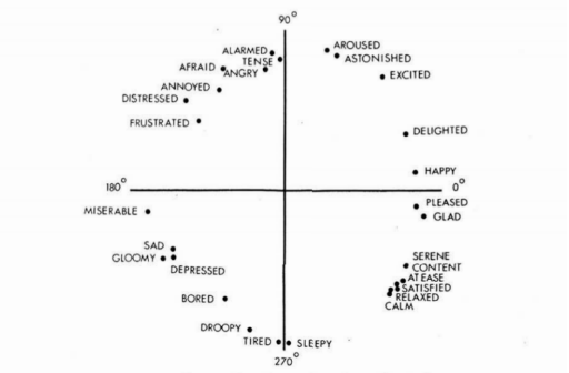在迪士尼主题公园内采集到的12,884张照片,需要各成员进行人工的分析和判断,分析照片拍摄方向、游客的行为举止以及游客所在的区域。完成以上任务之后,团队成员将提取到的游客面部数据上传到 Face++(旷视)平台上,利用该平台,提取出人脸所具有的愤怒、厌恶、恐惧、高兴、平静、伤心、惊讶7个情感维度,并同时得到人脸的年龄、性别和微笑程度,队员把所得游客情感数据进行整合和统计,最后利用罗素提出的情绪分类的环状模式,对所获得的情感数据进行加权,得到人脸的情感向量。