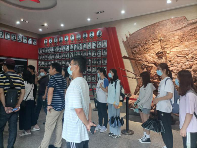 结束了梅山水库的参观,实践团队成员来到了金寨县烈士纪念馆,瞻仰牺牲的革命先烈。这里环境优美,绿树成荫。烈士纪念馆在青松翠柏的掩映下更加显得庄严肃穆。团队成员拾级而上,心中满是对革命先辈的崇敬。烈士陵园的台阶很多,但是每一级台阶的设立都有其丰富的历史意义。比如最先的59级台阶,寓意着金寨诞生的59位共和国开国将军;而最后的10级台阶寓意着在革命战争年代,金寨有10万多人参军征战。他们大多为国捐躯,后被追认为烈士的有一万多人。团队成员在纪念堂里认真听取了工作人员的讲解介绍,团队成员们被革命先烈英勇奋斗的精神深深打动了。今天的幸福生活是革命先辈用鲜血换来的,我们新一代青年人要继续奋斗,将红色江山世世代代传承下去。