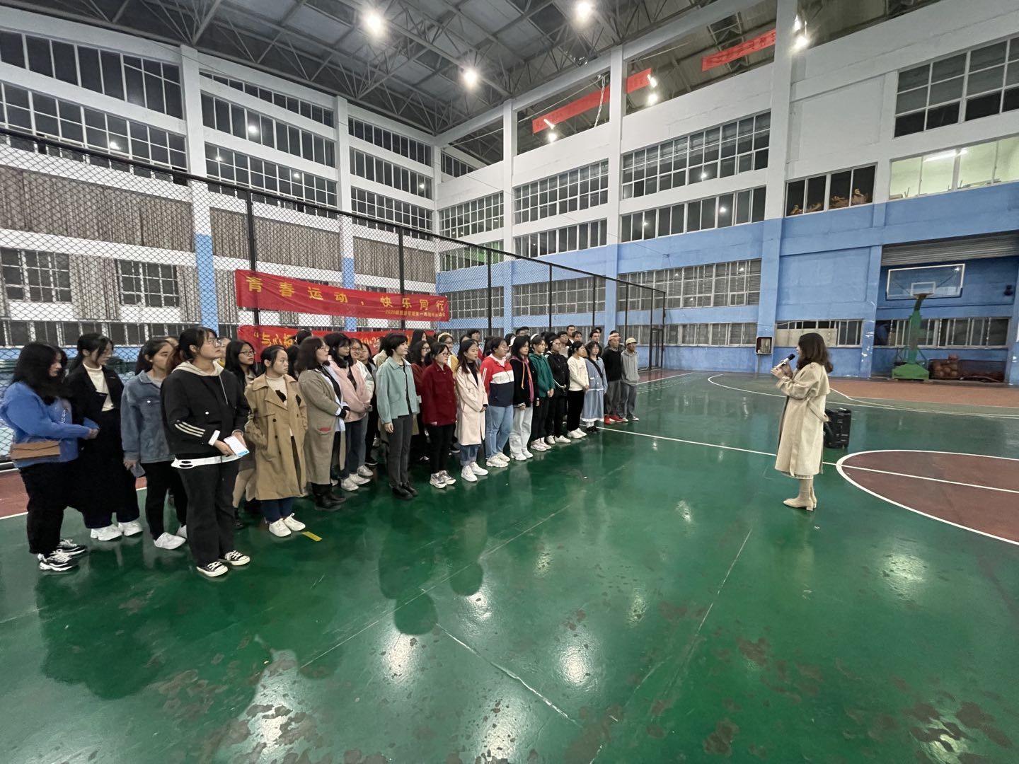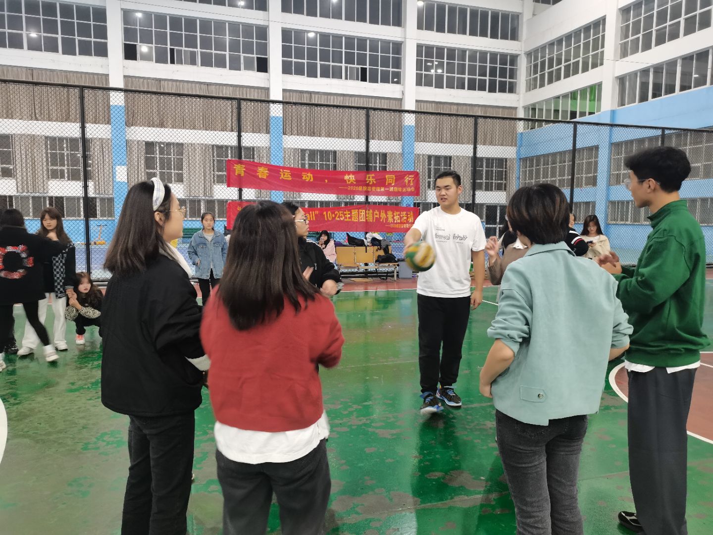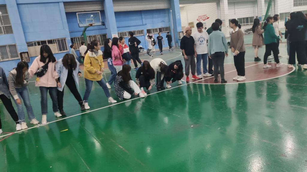 活动伊始,体育委员许林伟组织同学们用报数方式分成了6个游戏小组,每项游戏都会有小组积分,总分位于前三名的小组会有奖品鼓励。接下来就来到了游戏环节。游戏内容分共有四个部分,分别为“拔河”、“计时投篮”、“排球传递”以及“多人多足”。第一个热身小游戏拔河,6个小组,两两对抗,胜出的小组再进行第二轮,虽为传统团队游戏,同学们依旧表现出了高昂的情绪,看似比力气,实则考技巧,欢呼呐喊声此起彼伏,现场气氛热烈。接着第二项的“计时投篮”,每组派出三名同学,一人投球,两人传球,站在罚球线内计时两分钟投篮,数量最多的小组获胜。这个游戏中,男生投篮有优势,让人惊喜的是女生们也表现出不俗的实力,引得同学们连连叫好。休息间隔十分钟后,游戏来到了第三项“排球传递”,每组派出六名同学用手颠传排球,用时最短的小组获胜。传球过程中一片欢声笑语,运动场馆内处处暖意盈盈。最后一项游戏6个小组每位成员都需要参与其中,规定距离,同样是用时最短的小组获胜。多人多足最考验合作和默契,绑住的是脚,联动的是心,整个游戏过程中场馆内都洋溢着笑声和活力。随着游戏环节的结束,这次的户外素质拓展活动也进行到了尾声。班委给每位同学发放饮料,最后大家一起合影留念。游戏全力以赴,活动尽兴而归。