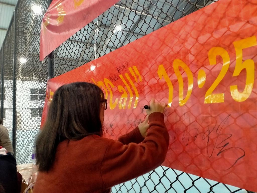 活动流程主要有四项。即同学签字、辅导员致辞、游戏环节和最后的合影留念。在活动开始之前,主持人徐雨菲先是号召大家在印有活动主题的横幅上签字,营造活动氛围。紧接着辅导员赵佳慧给同学们致辞开场白。鼓励同学们要珍惜难得机会,积极参与游戏。增进同学情谊,提高协作能力。致辞结束,户外素质拓展活动正式开始。