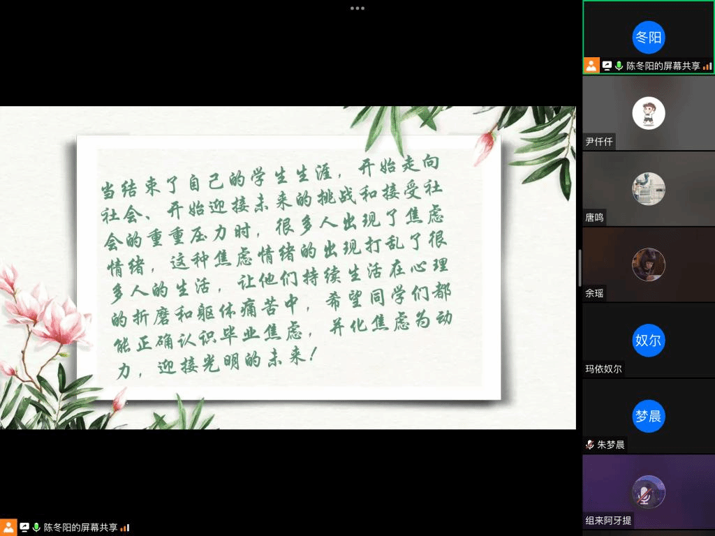 据悉,本次心理健康教育班会旨在帮助同学们正确认识和处理毕业焦虑,以积极向上的态度面对自己的学业和生活。为进一步推动大学生心理健康教育工作,切实提高大学生心理素质,帮助大学生健康成长营造良好的心理健康教育氛围。