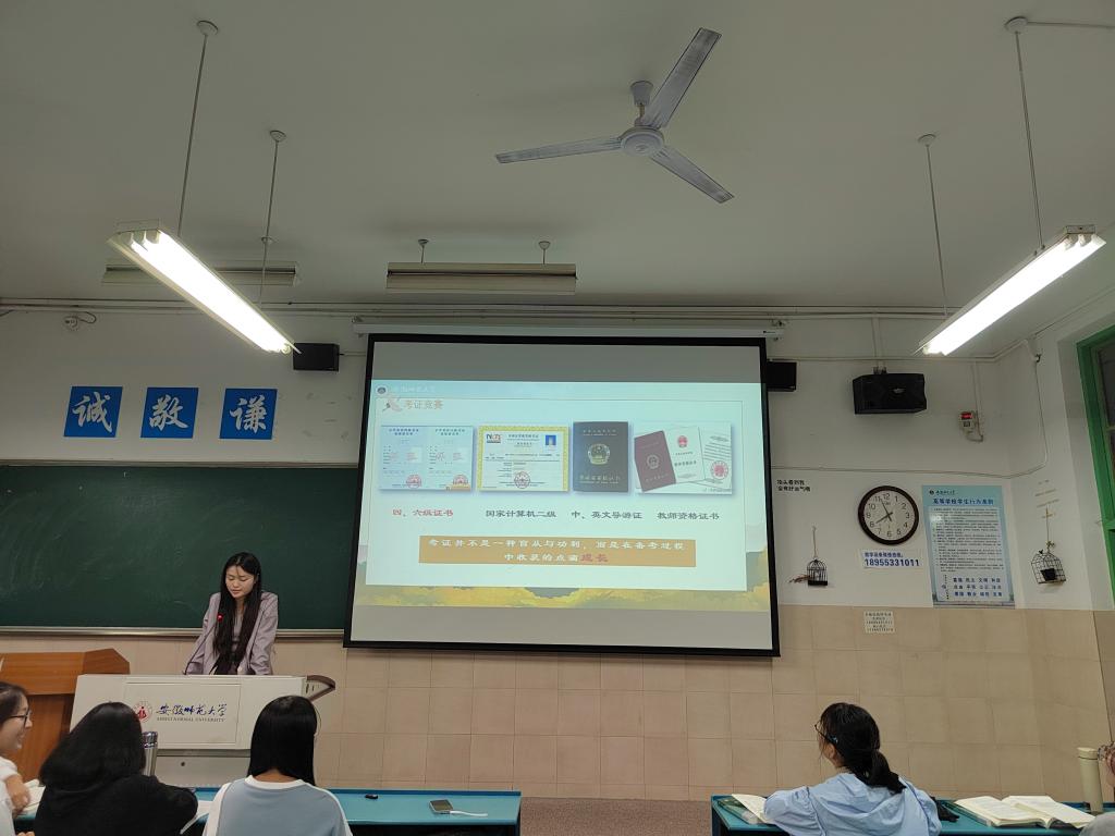 专业学习筑根基。分享过程中,针对学生们目前面临的学习目标和学习方法问题,学姐们不约而同地给出了答案。课堂内容理解十分重要,一定要紧跟老师节奏和思路进行学习,同时可结合自身实际情况进行课前预习、课后复习以及拓展阅读方面的工作。学习既是一种身份的责任与义务,更是一种自我的提升与完善。考证并不是一种盲从与功利,而是在备考过程中收获的点滴成长。