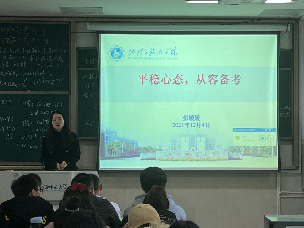 会议第二项:平稳心态,从容备考主题班会。彭媛媛表明,在最后的二十天里,调整好自己的心态,全力以赴备考。一步一脚印,焦虑是正常现象,正视考研压力,调整好自己的情绪和心态,坚持到最后。