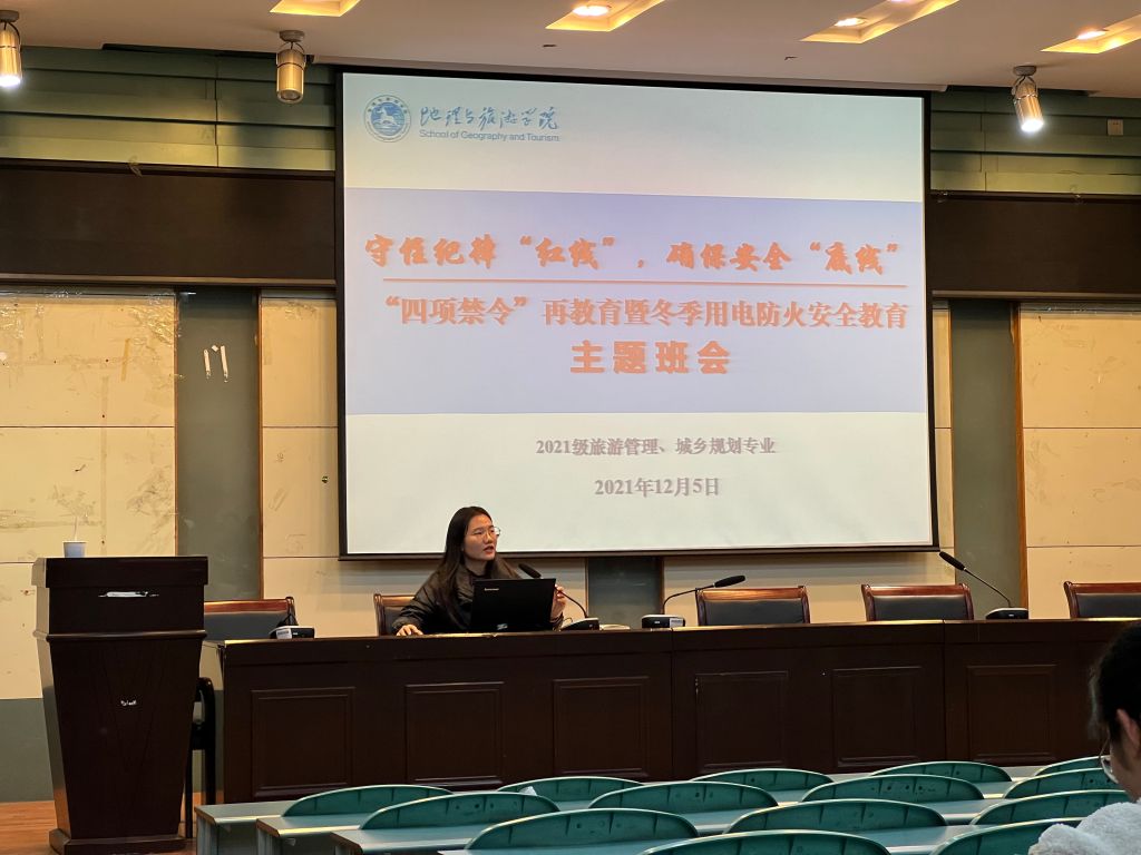 2021级城乡规划、旅游管理专业在实验楼101报告厅开展了“四项禁令”再教育暨攻击防火用电安全教育主题班会。班会由辅导员韦银艳主持。