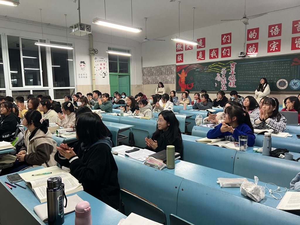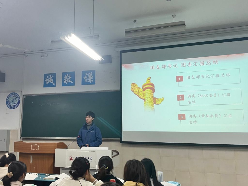 大会由四项议程组成。第一项是齐唱团歌。伴随着慷慨激昂的音乐,全体同学肃然起立,齐唱团歌。待同学们坐下后,第二项团支部委员会做工作汇报总结。团支书黄倩、团委组织委员张悦、团委素质拓展委员侯佳、团委宣传委员陈谊依次站上讲台,就本学期开始以来的各项工作状态进行工作汇报,向同学们展示近期工作进展和成效,并表达竭心尽力为同学服务的初心使命。第三项议程为优秀团员民主评议结果公布。会前经过团委组织,全体团员通过个人自评、团员互评和组织评价相结合的方式开展团员教育评议,最后选出优秀等次、合格等次的团员。大会第四项为参会女同做爱