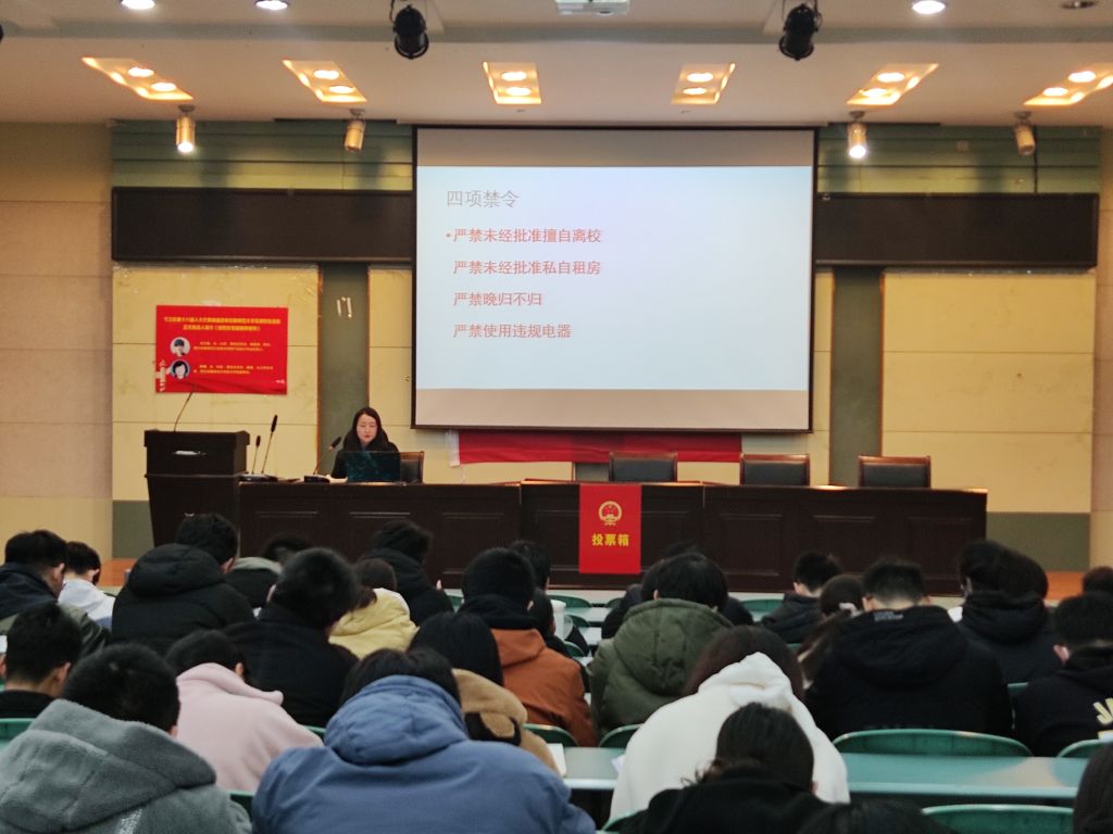 随后,彭媛媛向大家重申学校的四项禁令:“严禁未经批准擅自离校,严禁未经批准私自租房,严禁晚归不归,严禁使用违规电器。”希望同学们能时时刻刻将四项禁令和八个“严禁”牢记于心,坚持人走断电,注意交通安全、用电安全、饮食安全等。希望同学们注意个人安全和疫情防控态势,严格执行防控制度,落实各项疫情防控管理规定,严格执行“晨午晚检”“日报告”“零报告”等制度,做到非必要不出校、非不要不离芜,积极配合学校疫情防控管理,严格请销假制度。