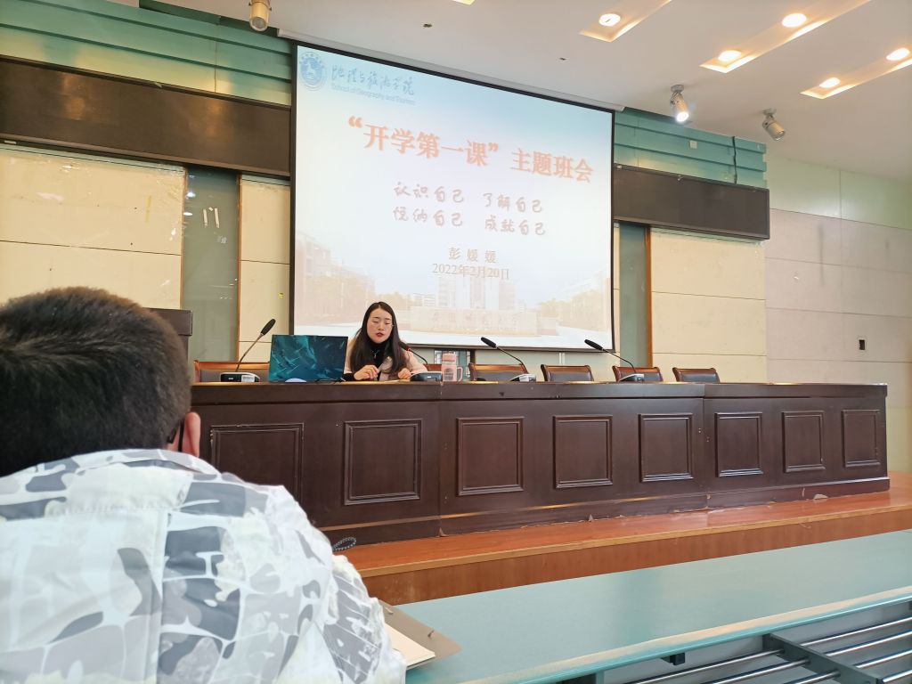 会上,彭媛媛从“认识自己、了解自己,悦纳自己,成就自己”四个方面展开,希望同学们调整好状态,制定好新学期的目标和计划,并就本学期的生活、安全、学习以及班级工作问题对同学们做出了要求和期待。生活方面,彭媛媛鼓励大家尽快调整心态融入学校生活,与室友和同学之间和谐相处,相互包容相互理解以建立良好的人际关系;同时多关注自己的身体与心理健康,课余时间加强身体锻炼,出现身体不适时及时就医;学习方面,要认真安排和规划自己的学习任务,要严格执行手机入袋制度,并提醒部分同学注意重缓考时间和第三轮选课时间;安全方面,彭媛媛针对饮食安全、用电安全、网络安全、交通安全等,要求大家尽量在学校食堂就餐,拒绝违规电器,做到人走断电,提高自身防范意识避免电信诈骗并注意交通安全,尽量不购买不使用电动车,严格执行电动车登基报备制度;特别强调在疫情防控严峻的形势下,坚持“非必要不外出”,严格履行请销假制度,严守“四项禁令”,自觉遵守学校各项规章制度。