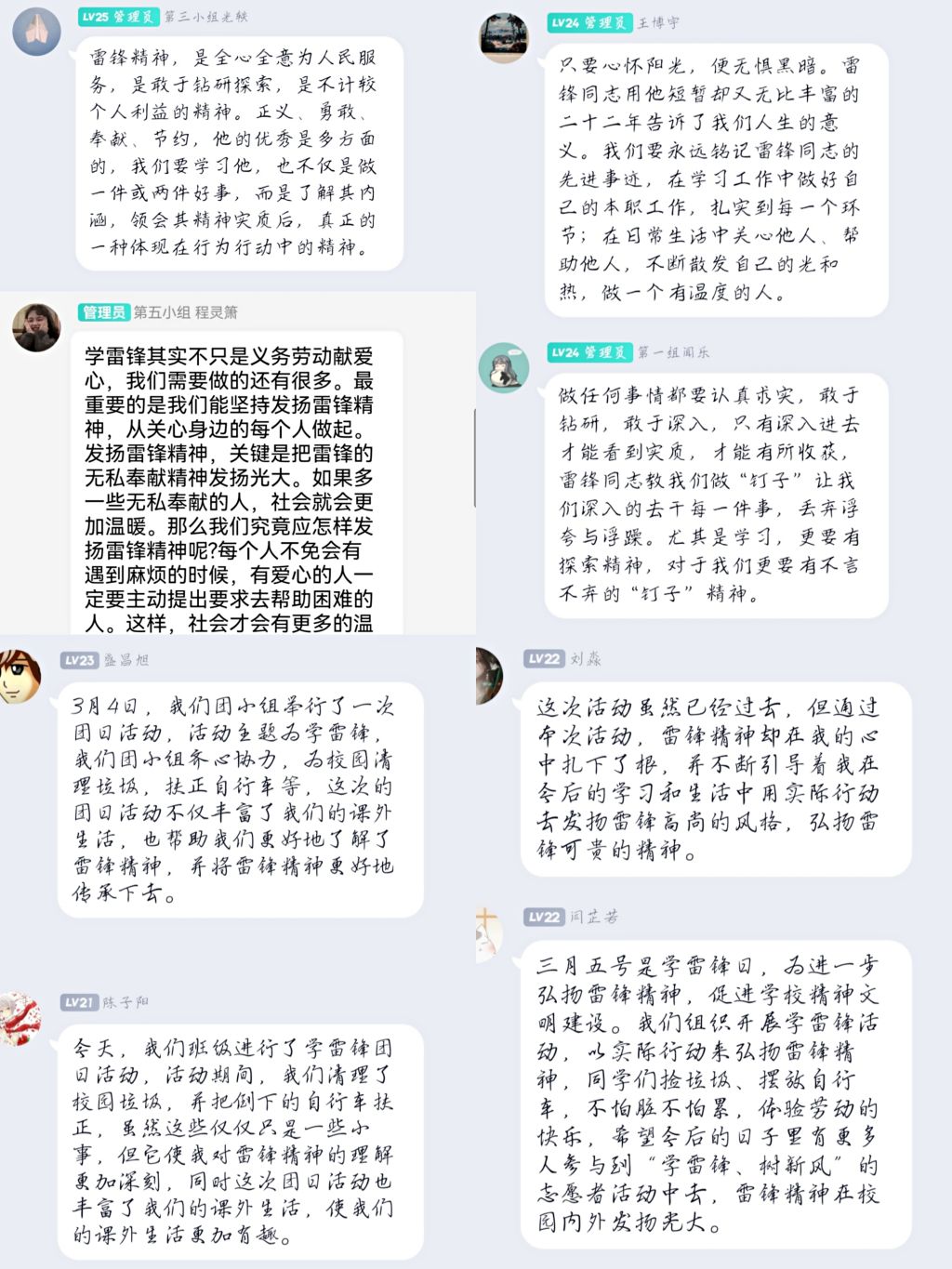 本次团日活动围绕“雷锋精神”的深刻内涵,开展了清理校园、清除牛皮癣、摆齐共享单车、养护绿地等各种形式的校园美化行动。活动伊始,同学们准时在学校南体入口集合,然后按各团小组分组行动,进行了近一个小时的志愿活动。同学们相互协作,全程热情高涨,在和煦的春光下他们的身影散布于校园各个角落,构成了一道亮丽的风景。活动接近尾声时,班级团支部也贴心地为大家准备了清爽可口的果茶,我们举起果茶一起欢呼,脸上洋溢的笑容是对我们此刻心情最好的表达。最后,我们在线上一起分享活动感想,本次团日活动完美落幕。