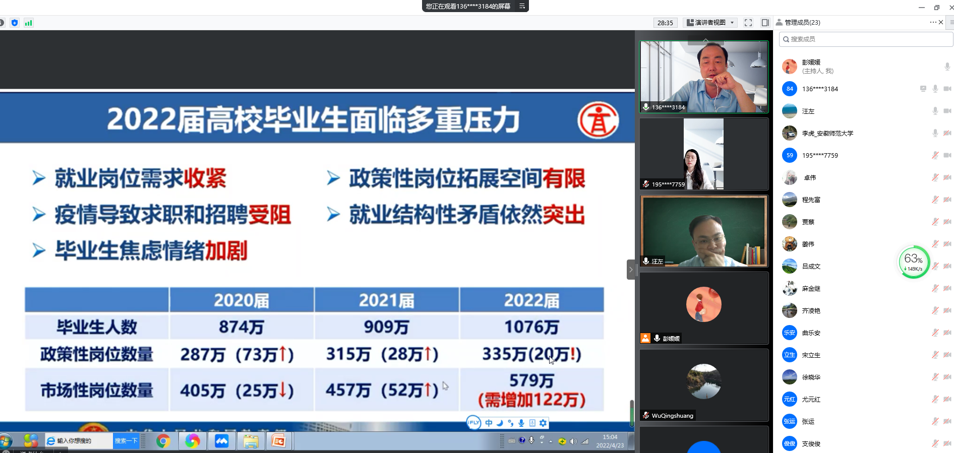 会议第二项,辅导员彭媛媛介绍2022届地理信息科学专业基本情况、列举了学生未就业的原因、详细分析了每一位未落实就业去向学生的具体情况,并就目前存在的困难提出解决方案。