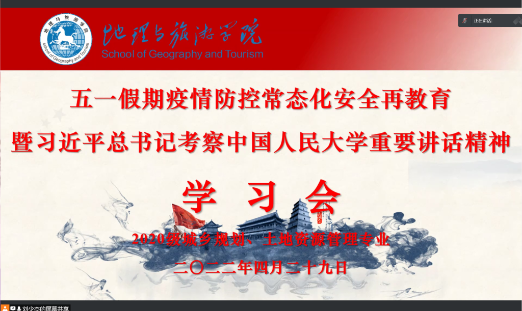 刘少杰 张楠) 为增强学生疫情防控意识,加强学生日常安全教育管理,4月29日晚,2020级城乡规划、土地资源管理专业召开五一假期疫情防控常态化安全再教育线上主题班会。此次会议由辅导员刘少杰主持,2020级城乡规划、土地资源管理专业全体成员参会。
