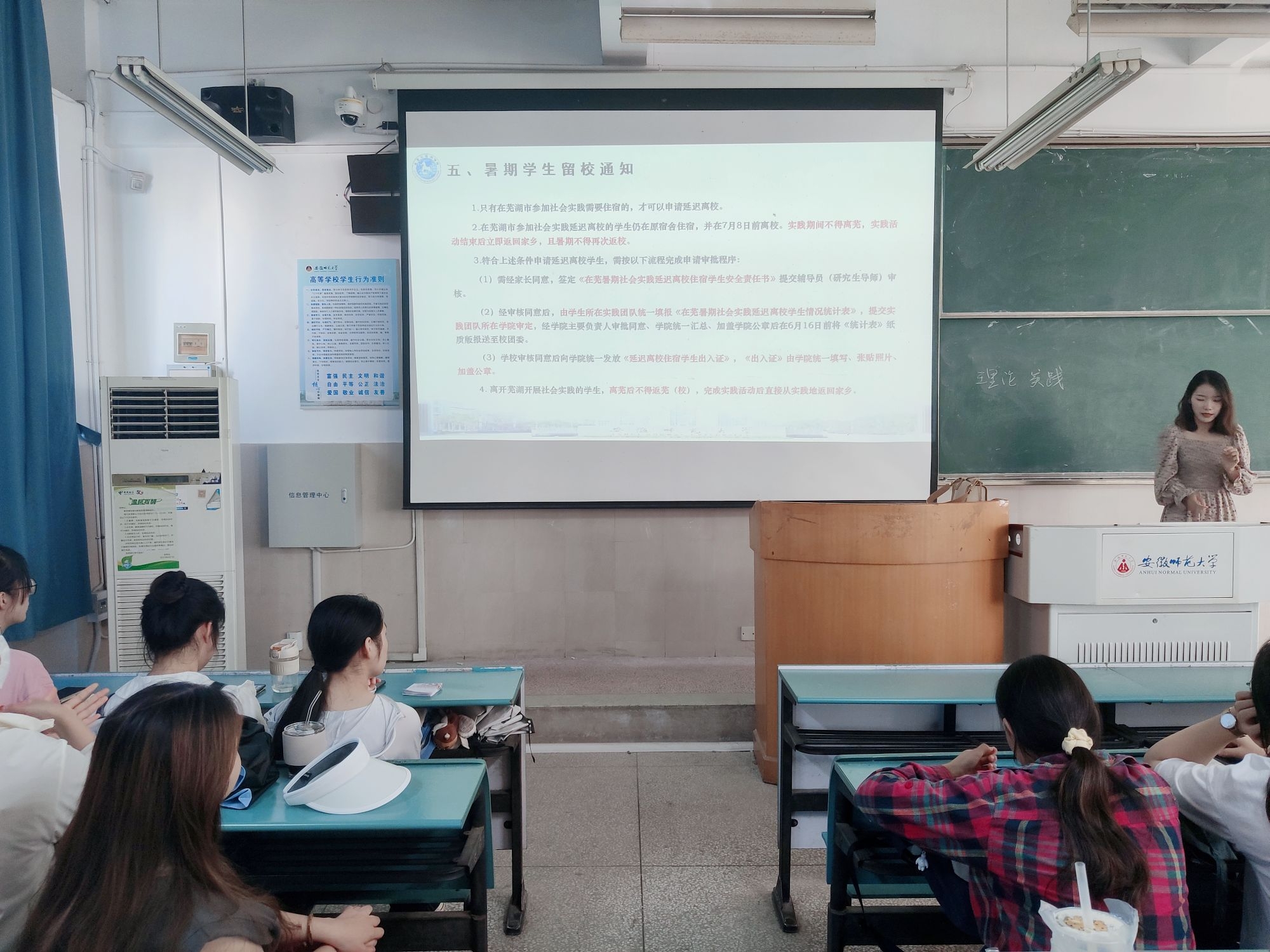 舒玉茹)期末考试临近,为帮助同学们以更佳的状态复习迎考,在营造班级良好备考氛围的同时,加强期末安全教育,增强学生安全防范意识。2022年6月10日下午。2020级旅游管理召开2021-2022第二学期末工作布置会暨安全教育主题班会。此次班会由辅导员赵佳慧主持召开,2020级旅游管理全体同学参加。