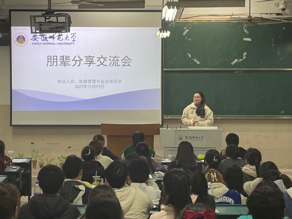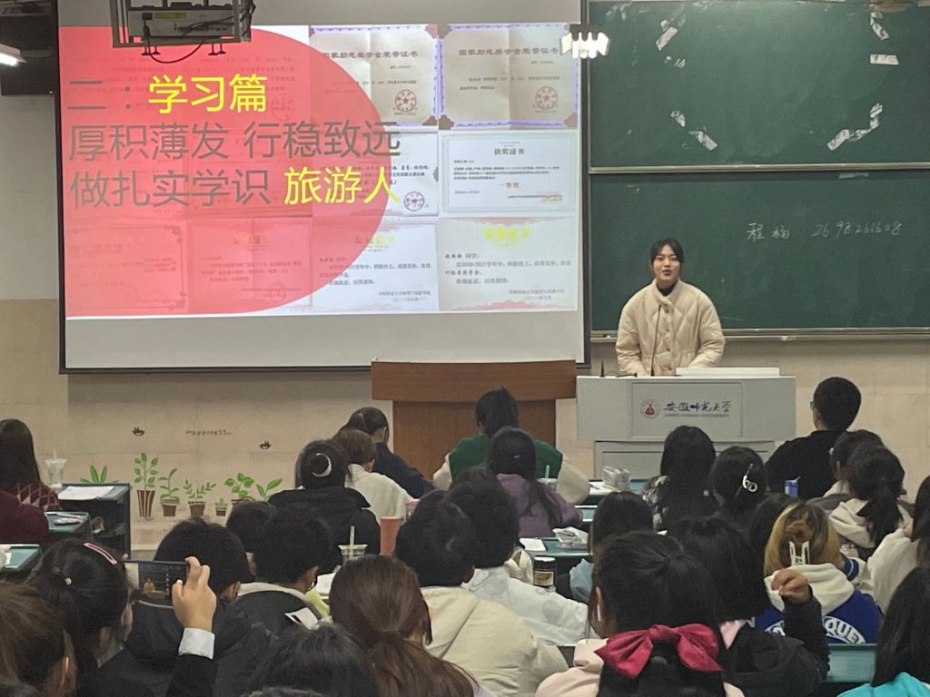 为帮助2022级旅游管理专业新生增强学习能力,提高综合本领,11月17日晚上7:00,在行知楼4号楼103教室开展了朋辈交流分享会。本次分享会邀请了19级旅游管理专业的程杨、鲍格格,21级旅游管理专业的王黎淑三位学姐进行经验分享。会议由班长卢江珊主持,22级旅游管理专业全体同学参加。