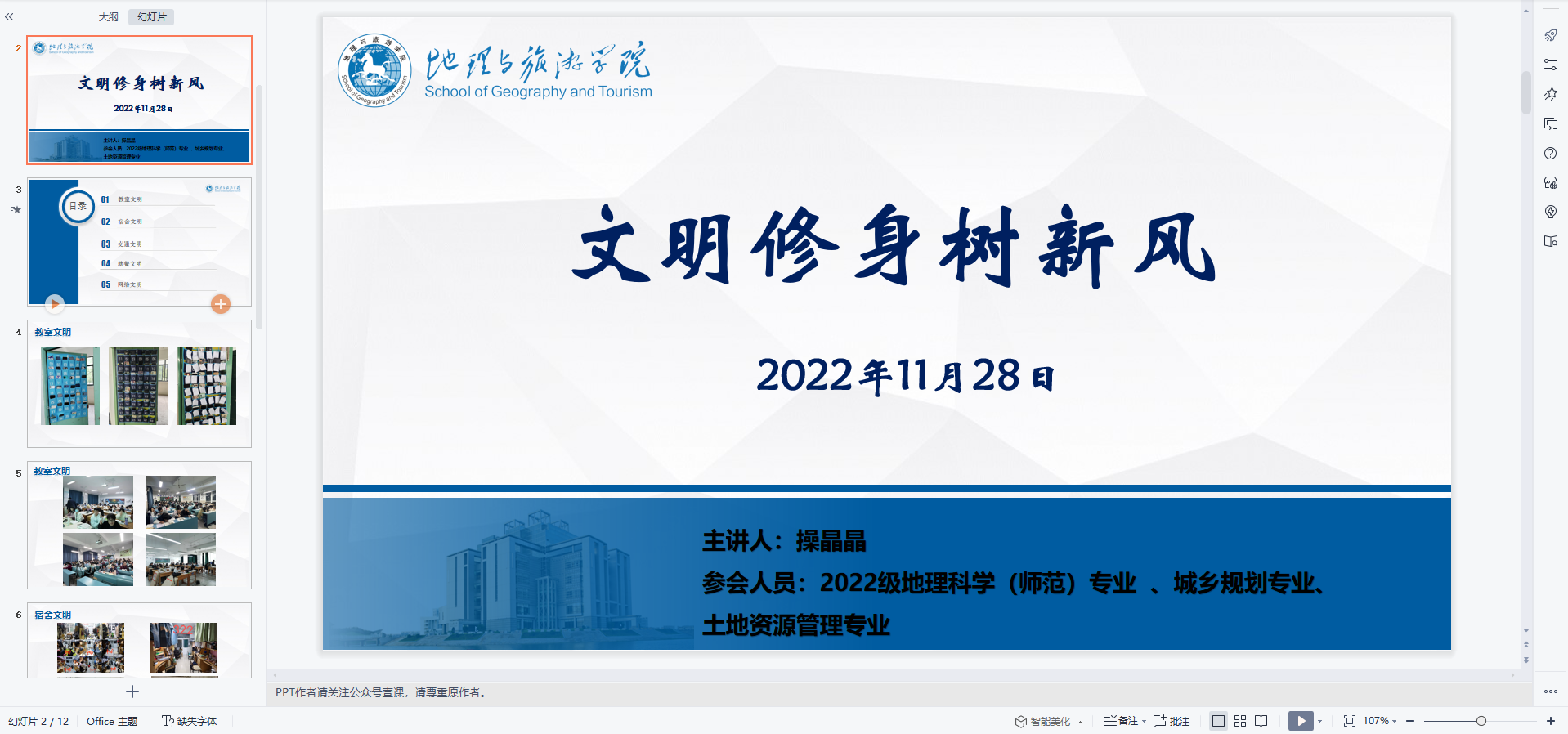 为提高学生文明意识及思想道德修养,加强大学生文明修身教育,2022年11月28日晚,2022级地理科学(师范)专业、土地资源管理专业、城乡规划专业开展“文明修身树新风线上主题班会,全体学生参会班会由辅导员操晶晶主持