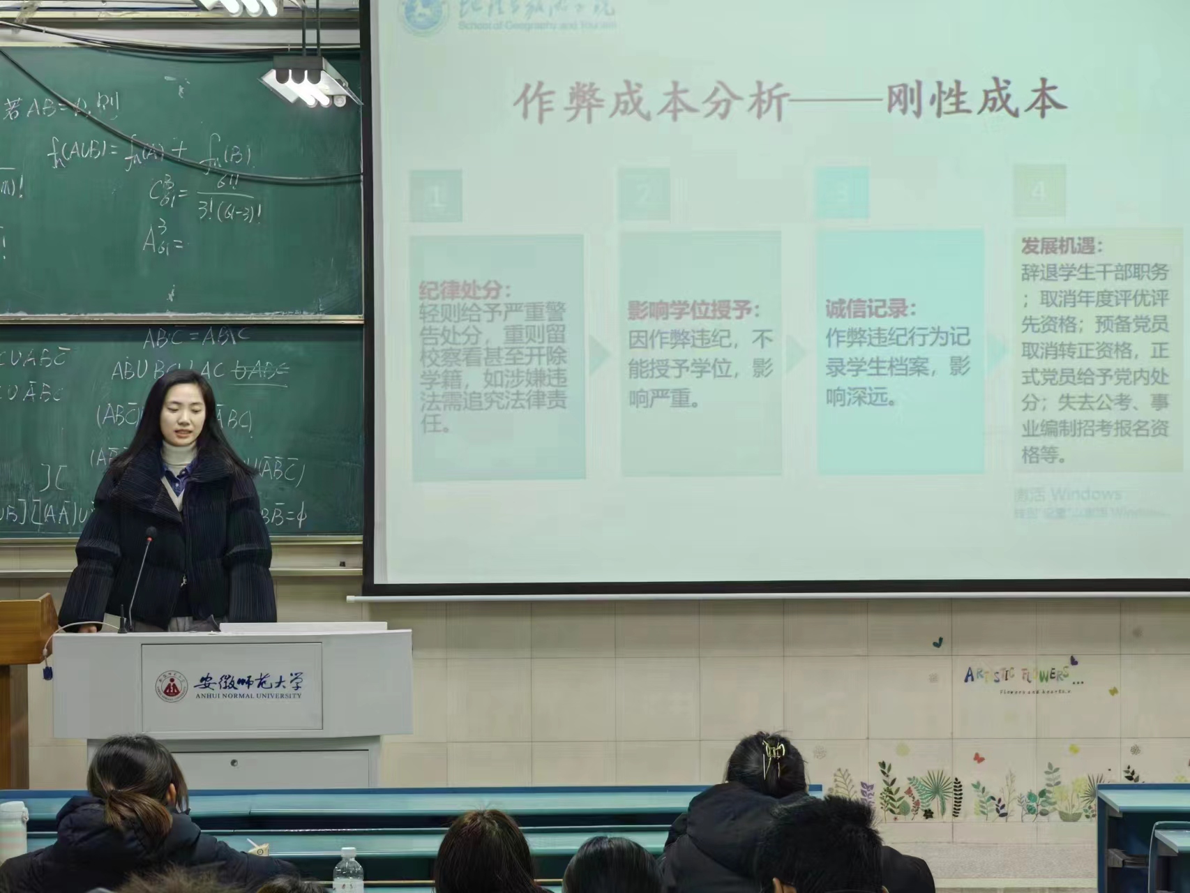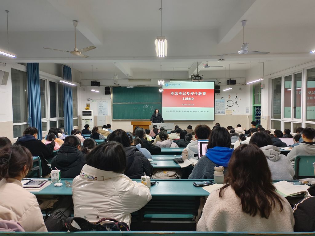 魏语菲、陈祥云)2月13日晚,2022级地理信息科学、地理科学(拔尖人才班)、土地资源管理分别于教学楼4号楼201、202、302教室举行考风考纪教育主题班会,会议由辅导员陈祥云主持,全体180名同学参与此次会议。