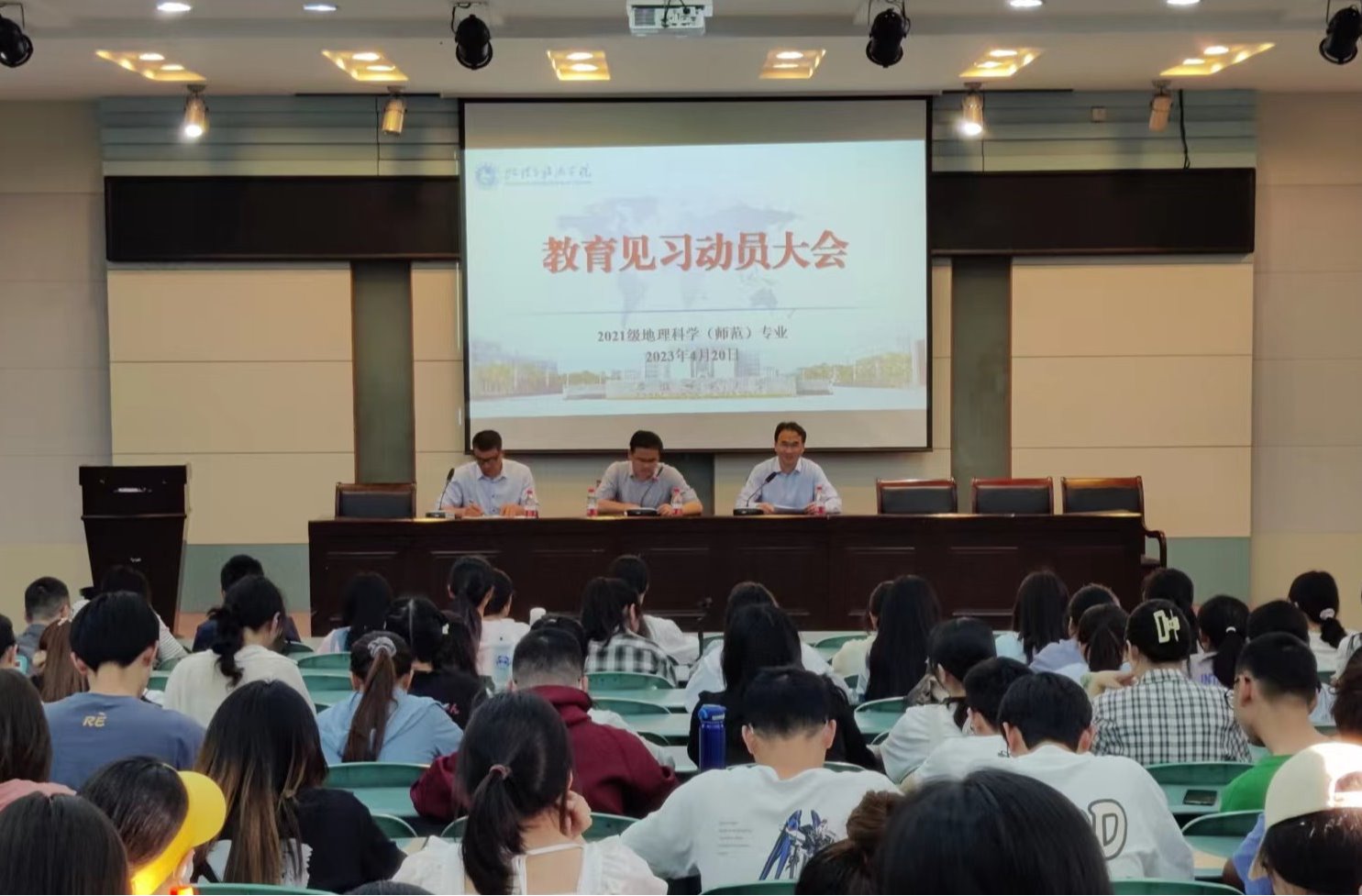 党委副书记付勇、副院长杨兴柱、专业负责人朱永恒及见习指导老师徐光来、周迎秋、汪勇等出席会议,2021级地理科学(师范)全体学生参加。