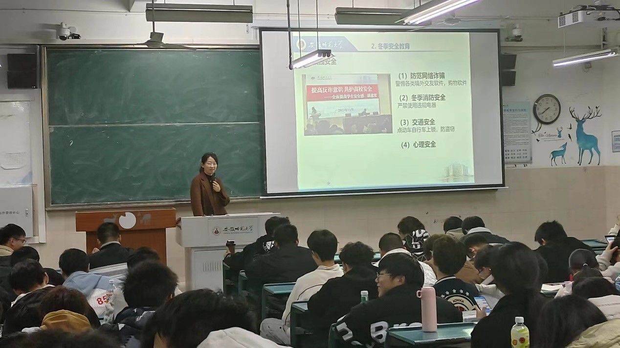 大学生护航行动的落实,提升同学们的冬季安全防范意识,有效防范安全事故发生,保障同学们在校的健康成长。2023级本科生兼职辅导员李婷君老师于2023年12月7日晚在安徽师范大学花津校区4号楼202教室召开本科生冬季安全教育主题班会,2023级土地资源管理1班、2023级城乡规划1班全体同学到场参加。