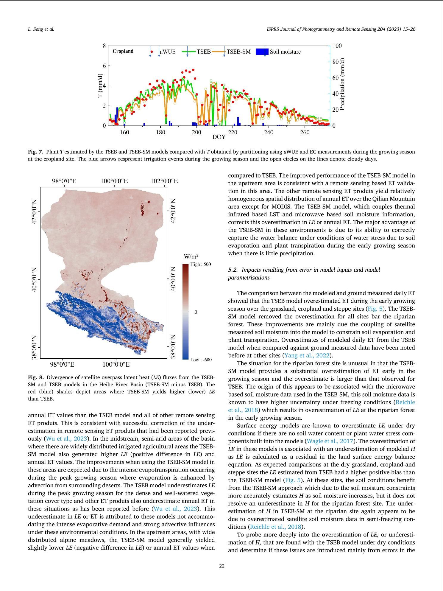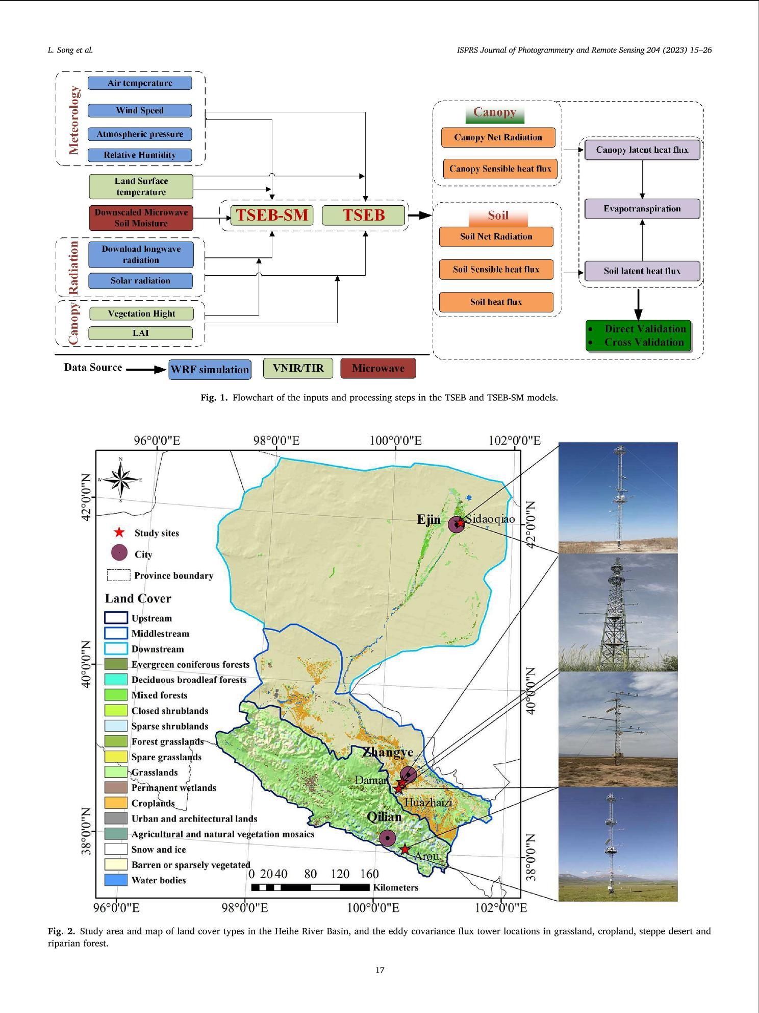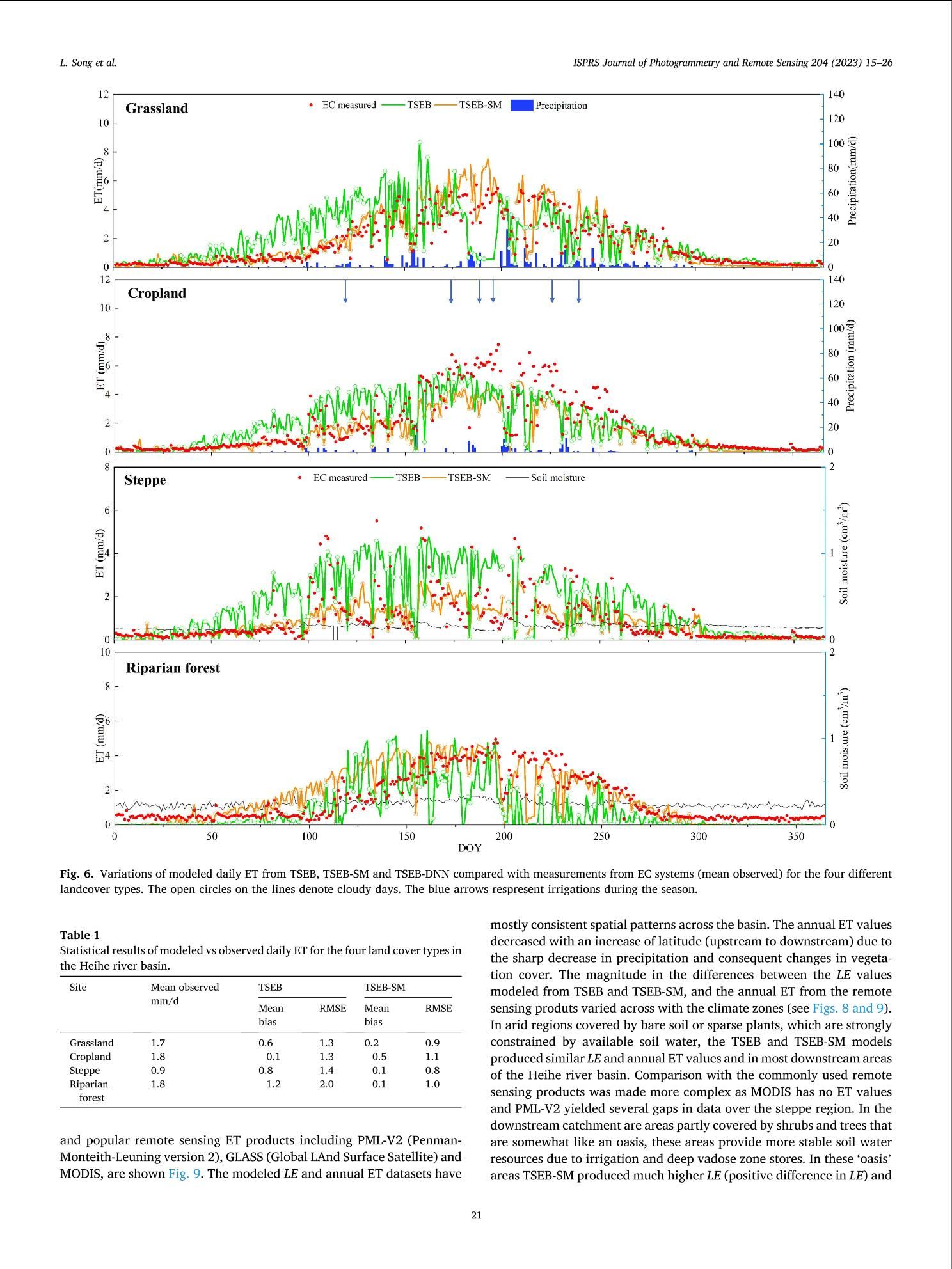 发展了水热耦合双层地表蒸散发遥感估算模型,结合空间降尺度微波卫星遥感土壤水分,热红外卫星地表温度,实现了模型空间尺度扩展,和流域尺度地表蒸散发及土壤蒸发和植被蒸腾遥感反演,显著提升了土壤水分胁迫下地表蒸散发遥感反演精度。