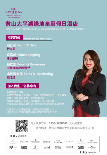 酒店按五星级标准设计建造,建设面积42092平方米,是洲际酒店集团中一家国际化的五星级酒店,坐拥太平湖畔,环境优美宜人。拥有247间优雅的客房,中西餐厅、大堂酒吧、健身房、行政酒廊等服务设施一应俱全。在黄山太平湖绿地皇冠假日酒店(黄山盛高半岛房地产发展有限公司太平湖酒店分公司),我们的致胜之道至关重要;我们相信今天的全情投入造就通向美好未来的坦途。如果你是一位尽责的员工,我们会为您提供“尽炫自我的空间”。我们正在招募以下工作伙伴:
