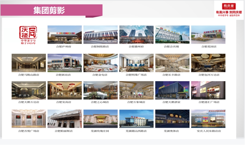 同庆楼创立于1925年,是国家正式认定的中华老字号餐饮企业,至今已有近百年的历史,1999年被国家贸易部评定为中华老字号,2006年国家商务部再次认定同庆楼为中华老字号,2010年同庆楼作为中国8大菜系的徽菜代表企业入驻上海世博会,2014年又被国家商标总局认定为“中国驰名商标”