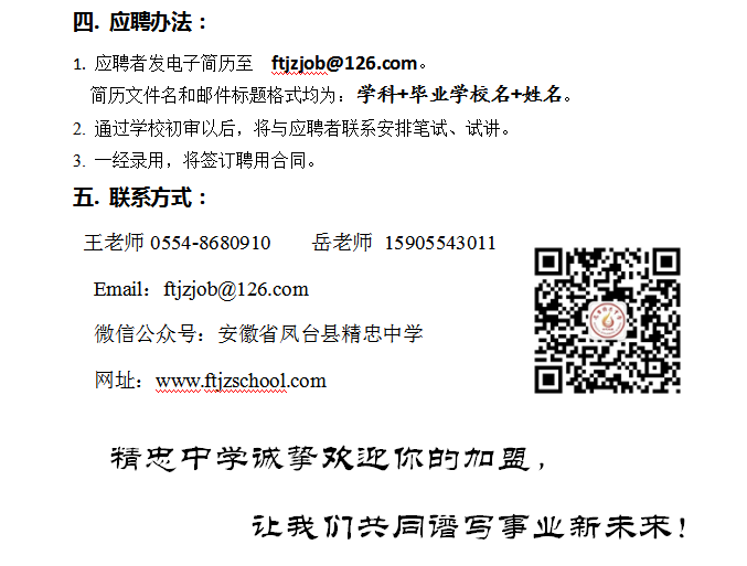 根据学校发展需要,为建立一支素质优良、结构合理的教师队伍,确保高品位办学、高质量育人,本着“公开招聘、公平竞争、公正录用”的原则,现诚邀有志于教育事业的优秀学子加盟我校,共创“精忠”教育大业。