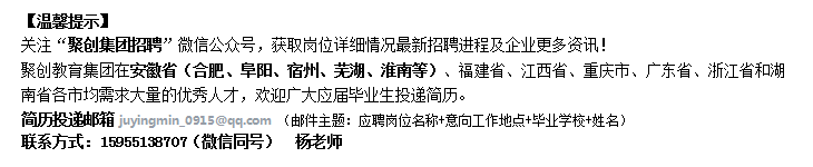 集团面向全国高校精英学子开展新一轮高潜质人才招募与培养计划——“聚星计划”。集团向2021年至2022年的毕业生开放招募“营销类”、“职能类”、“教师类”和“网络运营类”岗位,希望更多有热血、有激情、有梦想、有态度的大学生能够加入聚英,通过集团的系统培训和多重考核,使人才快速走向管理岗位,成为聚英教育集团未来发展的中坚力量,成为“聚星”!